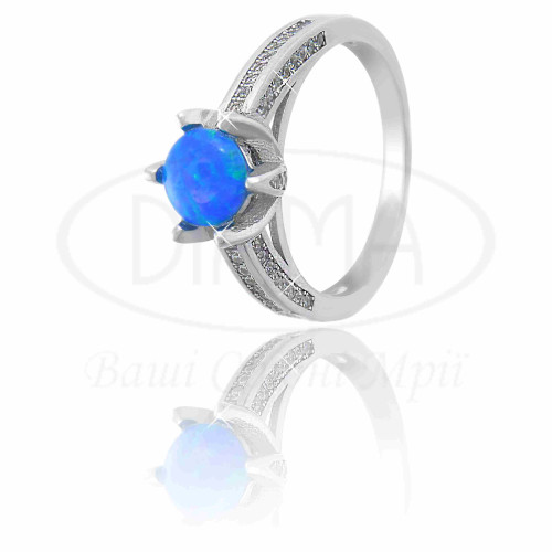 Каблучка срібна з синім круглим опалом та білим цирконом. Срібло 925 проби, покрите родієм. В наборі присутні Каблучка, сережки та підвіска.