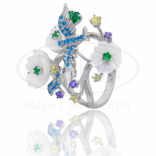 Каблучка срібна в стилі Роберто Браво у формі квітів. Срібло 925 проби, покрите родієм. Вставка: перламутр, мікс циркону. Комплект складається з каблучки, підвіски та сережок.