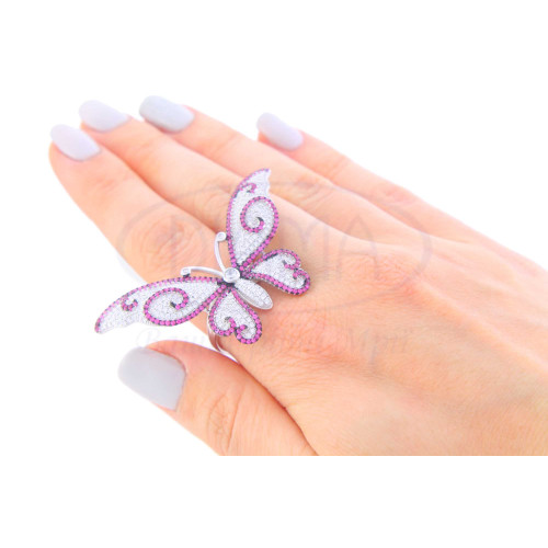 Каблучка срібна у формі Метелика з малиновим та білим цирконом. Срібло 925 проби, покрите родієм.