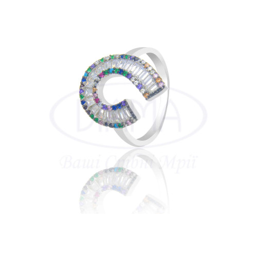 Каблучка срібна у формі підкови з кольоровим цирконом. Срібло 925 проби,покрите родієм. У наборі присутні каблучка, сережки та підвіска.