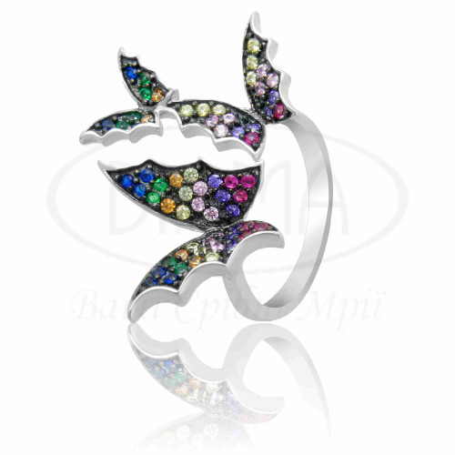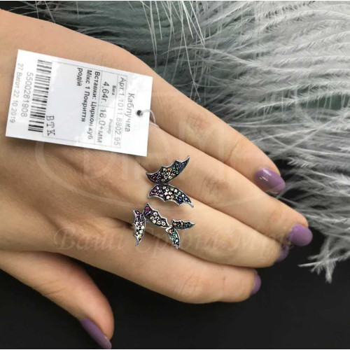 Срібна каблучка в формі "Метеликів" з кольоровим цирконом. Срібло 925 проби, покрите родієм.