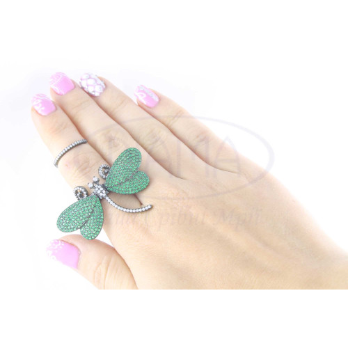Срібна каблучка з білим та зеленим цирконом. Срібло 925 проби, покрите чорним родієм. Каблучка виготовлена в формі "стрекози" з крилами, що рухаються під час згинання пальців.