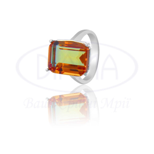 Каблучка срібна з прямокутним султанітом, який змінює відтінок при різному освітленні до зеленого, жовтого, малинового або яскраво помаранчевого. Діаметр - 16×12 мм. Срібло 925 проби, покрите родієм. В комплекті каблучка, сережки та підвіска.