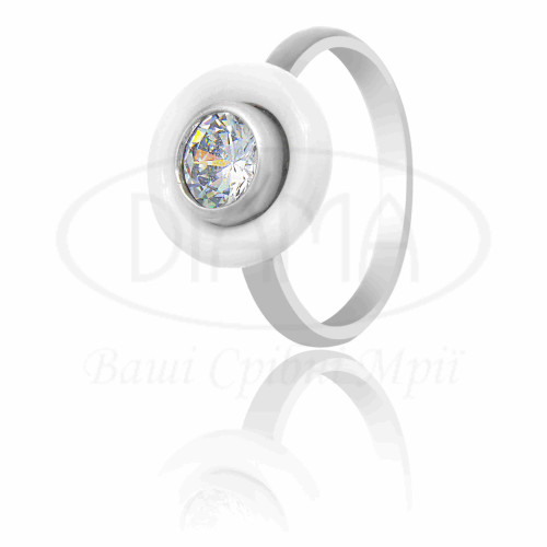 Срібна каблучка з білою ювелірною керамікою та цирконом. Срібло 925 проби, покрите родієм. Розмір головного елементу 12,5 мм.
