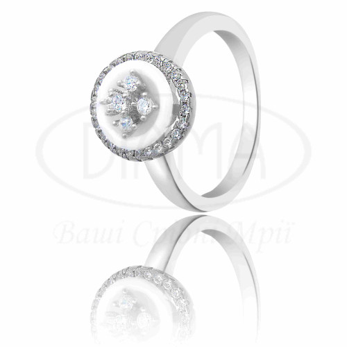Срібна каблучка з білою керамікою та цирконом. Срібло 925 проби, покрите родієм.