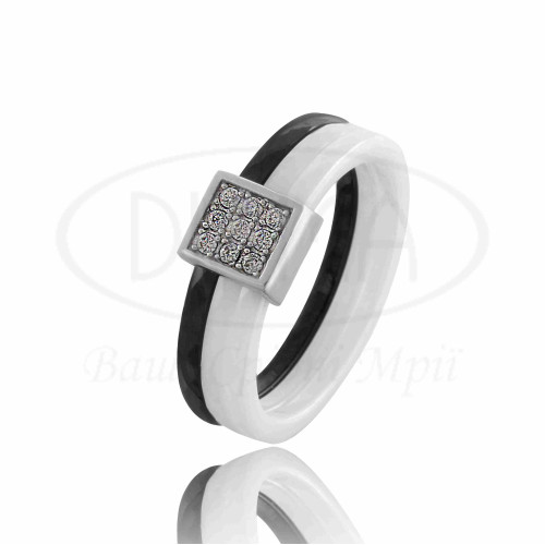 Каблучка потрійна з білої та чорної кераміки та зі срібною накладкою, що сполучає всі частини. Вставка білий Циркон. Срібло 925 проби, покрите родієм.