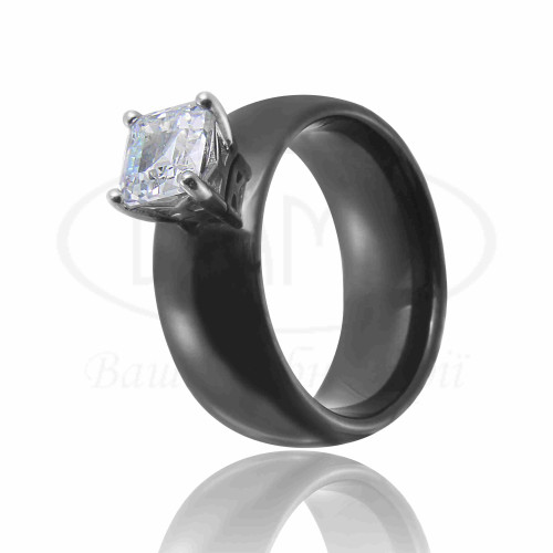 Каблучка з чорної кераміки та срібла з білим цирконом. Срібло 925 проби, потрите родієм.