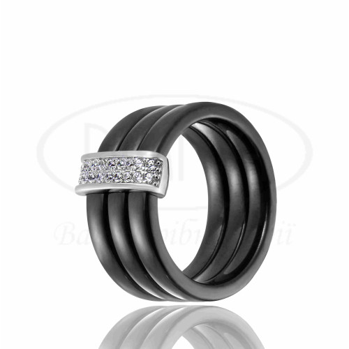 Каблучка потрійна з чорної кераміки та зі срібною накладкою, що сполучає всі частини. Вставка білий Циркон. Срібло 925 проби, покрите родієм.