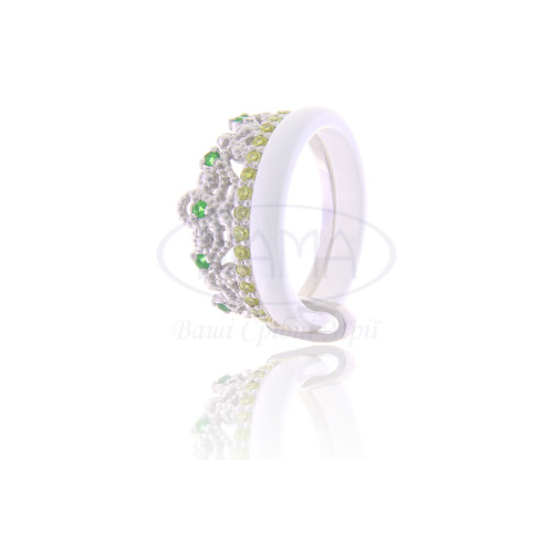 Каблучка срібна в формі корони з білою ювелірною керамікою та кольоровим цирконом. Срібло 925 проби, покрите родієм.