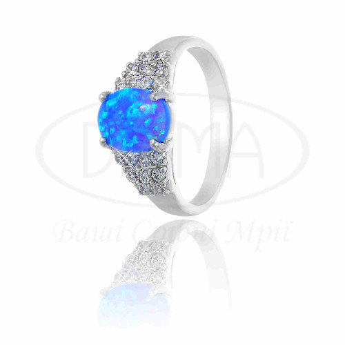 Каблучка срібна з синім опалом та білим цирконом. Срібло 925 проби, покрите родієм. До комплетку входять: каблучка та сережки.