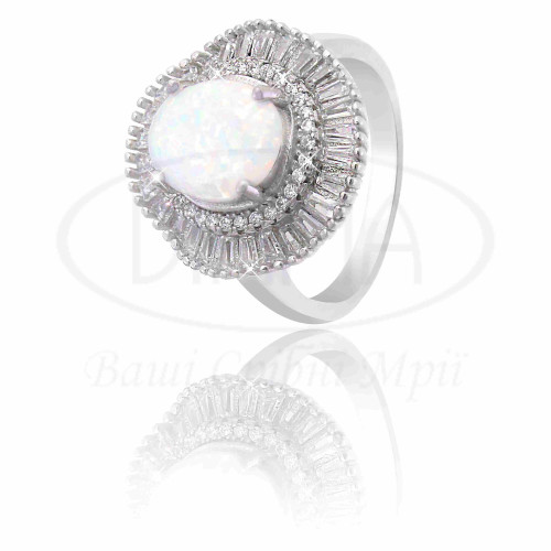 Каблучка срібна з білим опалом та білим цирконом. Срібло 925 проби, покрите родієм. В наборі: каблучка, підвіска та сережки.