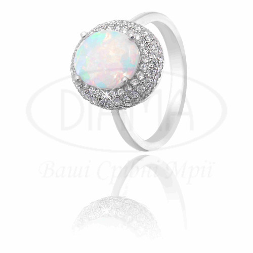 Срібна каблучка з білим Опалом та білим цирконом. Срібло 925 проби, покрите родієм. В наборі присутні каблучка, сережки та підвіска.