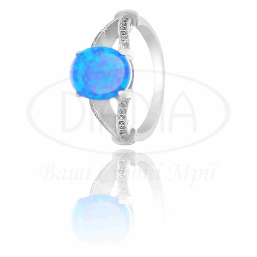 Каблучка срібна з синім опалом та білим цирконом. Срібло 925 проби, покрите родієм. В комплекті каблучка, підвіска та сережки.