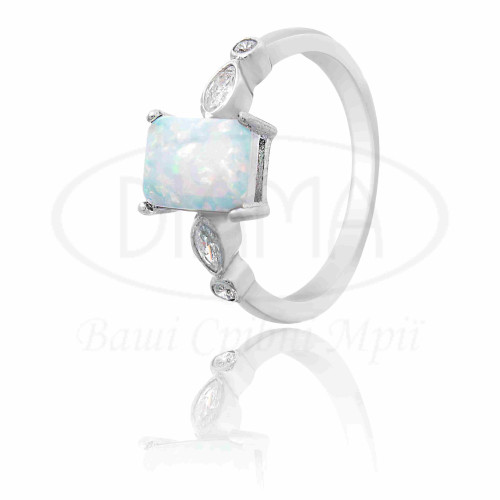 Каблучка срібна з білим прямокутним опалом та цирконом. Срібло 925 проби, покрите родієм. В наборі присутні Каблучка, сережки та підвіска.