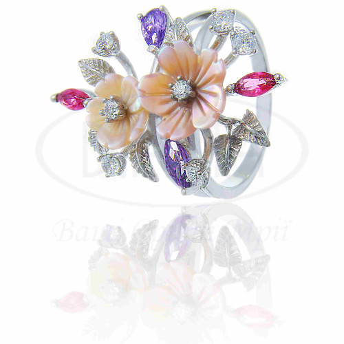 Срібна каблучка з кольоровим цирконом та перламутром. Срібло 925 проби, покрите родієм. Комплект виконаний в стилі Роберто Браво, у формі квітів. Складається з каблучки та сережок.