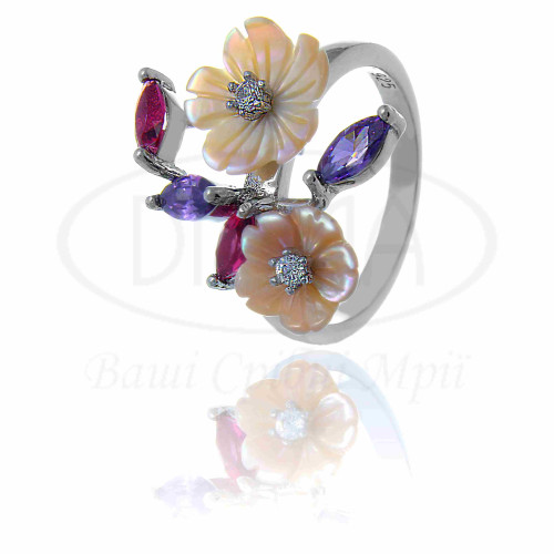 Срібна каблучка з кольоровим цирконом та перламутром, в стилі Роберто Браво. Срібло 925 проби, покрите родієм. В наборі присутні каблучка, підвіска та сережки.