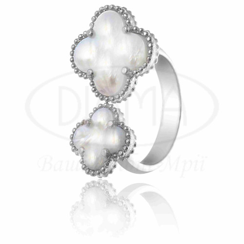 Каблучка срібна з білим перламутром. Срібло 925 проби, покрите родієм. Каблучку виготовлено в формі "Клевер". В наборі присутні каблучка, підвіска та сережки. Розмір головних елементів - 15 мм та 11 мм.