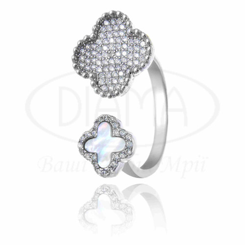 Каблучка срібна 925 проби, покрита родієм. Вставка білий Перламутр у формі "Клевер" та білий циркон. В комплекті каблучка, підвіска, сережки та кольє.