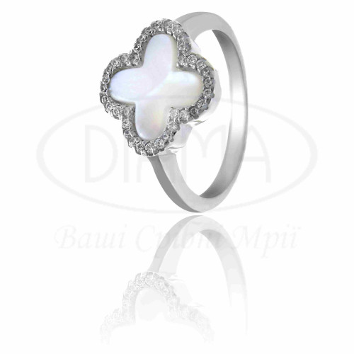 Каблучка срібна з білим перламутром та білим цирконом. Срібло 925 проби, покрите родієм. Каблучка виготовлена в формі "Клевер". В наборі присутні каблучка, підвіска та сережки.