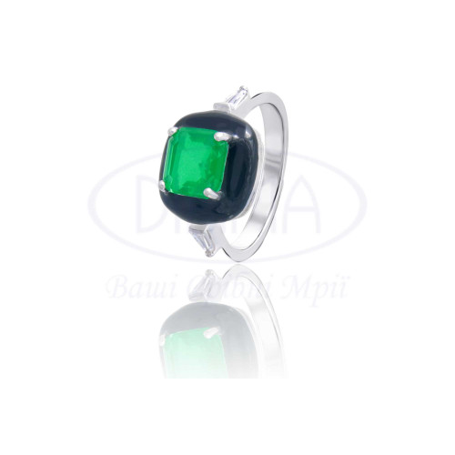 Срібна каблучка з білим та зеленим цирконом з чорною емаллю. Срібло 925 проби, покрите родієм. В наборі присутні каблучка, сережки та підвіска.