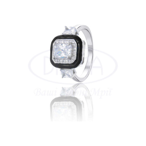 Срібна каблучка з білим цирконом та чорною емаллю. Срібло 925 проби, покрите родієм. В наборі присутні каблучка, сережки та підвіска.