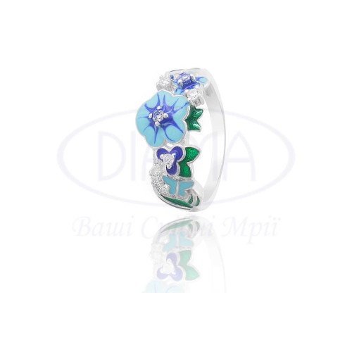 Каблучка срібна з квітами покритими блакитною емаллю та білим цирконом. Срібло 925 проби, покрите родієм. В наборі присутні також сережки та підвіска.