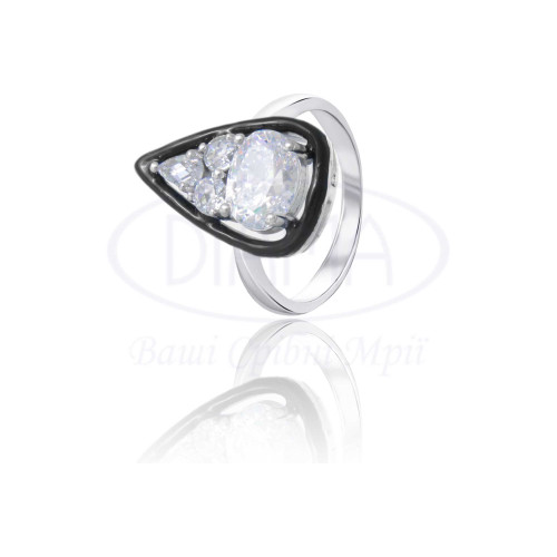 Срібна каблучка з білим цирконом та чорною емаллю. Срібло 925 проби, покрите родієм. В наборі присутні каблучка, сережки та підвіска.