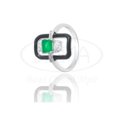 Срібна каблучка з зеленим та білим цирконом, а також чорною емаллю у формі прямокутника. Срібло 925 проби, покрите родієм. В наборі присутні каблучка, сережки та підвіска.