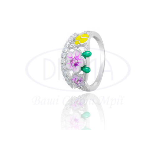 Каблучка срібна у формі квітів з рожевою емаллю та білим цирконом. Срібло 925 проби, покрите родієм. В наборі присутні також сережки та підвіска.