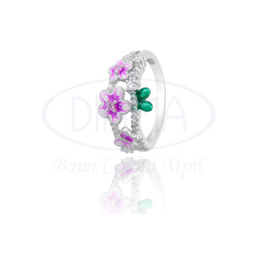 Каблучка срібна з квітами покритими рожевою емаллю та білим цирконом. Срібло 925 проби, покрите родієм. В наборі присутні також сережки та підвіска.
