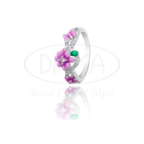 Каблучка срібна з рожевою емаллю, що покриває квіти та білим цирконом. Срібло 925 проби, покрите родієм. В наборі присутні також сережки та підвіска.