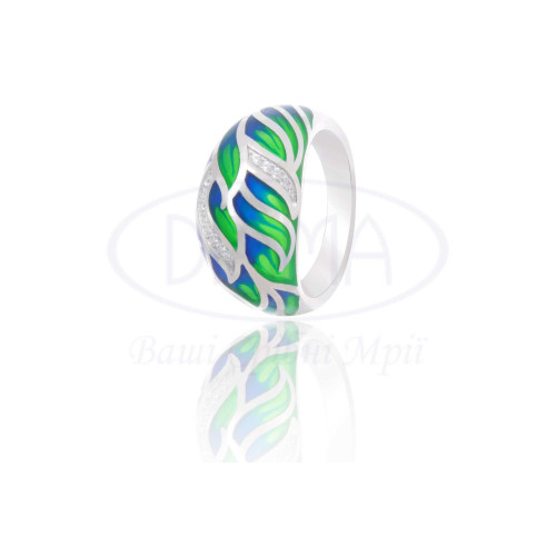 Срібна каблучка з кольоровою емаллю та білим цирконом. Срібло 925 проби, покрите родієм. Ширина каблучки 10 мм. В комплекті каблучка, сережки та підвіска.