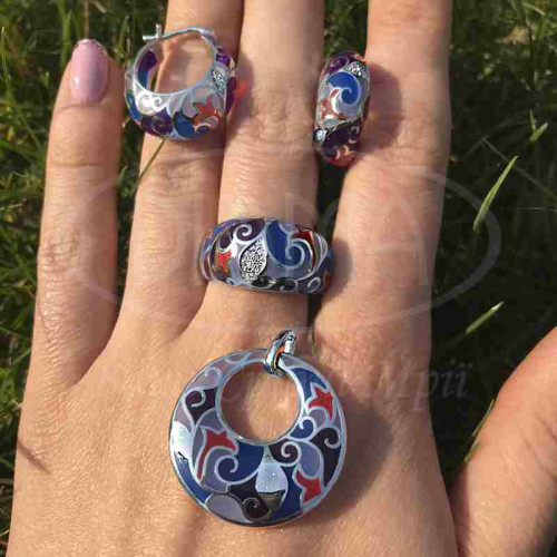 Срібна каблучка з кольоровою емаллю та білим цирконом. Срібло 925 проби, покрите родієм. Ширина каблучки 12 мм. В наборі є каблучка, сережки та підвіска.