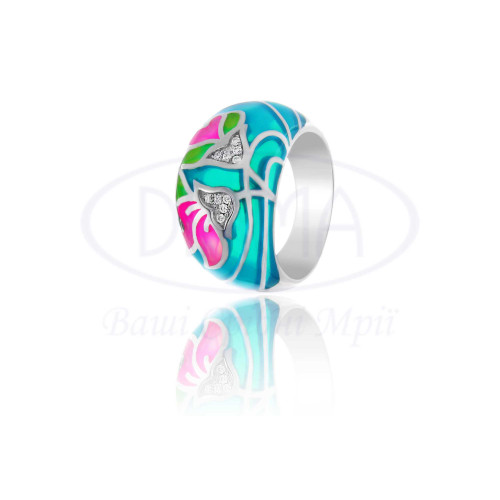 Срібна каблучка з кольоровою емаллю із зображенням квітки та білим цирконом. Срібло 925 проби, покрите родієм. Ширина каблучки 12 мм. В комплекті каблучка, сережки та підвіска.