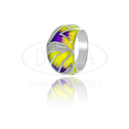 Срібна каблучка з кольоровою емаллю із зображенням листя та білим цирконом. Срібло 925 проби, покрите родієм. Ширина каблучки 12 мм.В комплекті каблучка, сережки та підвіска.