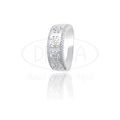 Каблучка срібна з білим цирконом та візерунками у вигляді троянд. Срібло 925 проби, покрите родієм. В комплекті каблучка, сережки та підвіска.