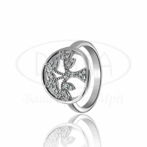 Каблучка срібна з білим цирконом у формі кола, в середині якого знаходиться дерево. Срібло 925 проби, покрите родієм. Розмір головного елементу каблучки 15 мм. В комплекті каблучка, сережки та підвіска.