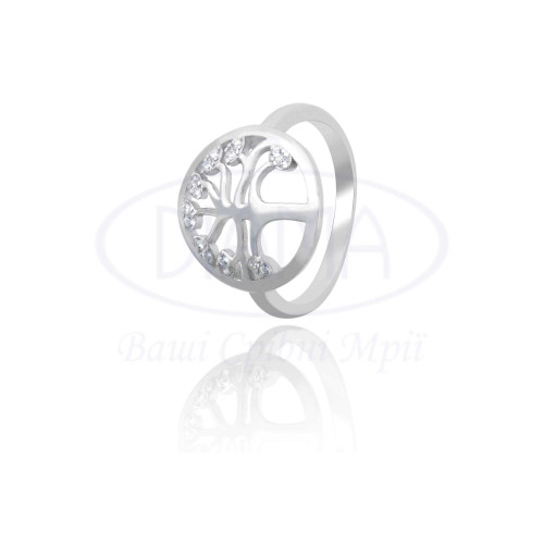 Срібна каблучка з деревцем, що прикрашене білим цирконом. Срібло 925 проби, покрите родієм. В наборі присутня каблучка, сережки та підвіска.