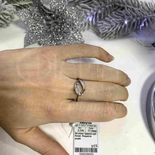 Срібна каблучка з білим цирконом. Срібло 925 проби, покрите родієм. Розмір головного елементу каблучки 9х13 мм. У наборі кольє, браслет,сережки та каблучка.