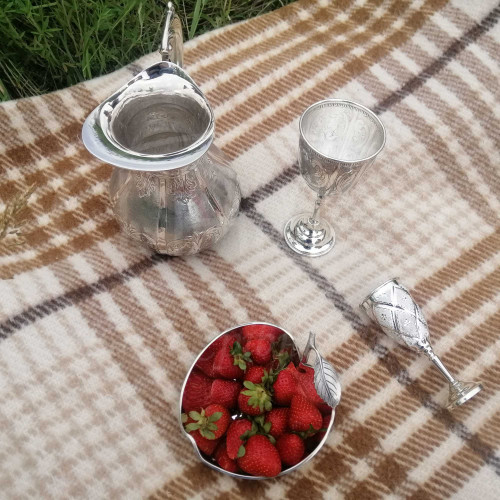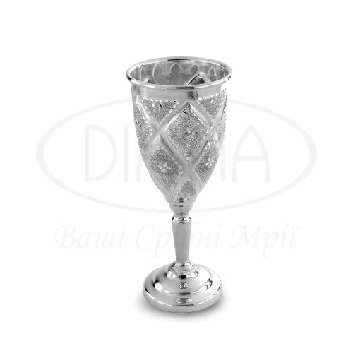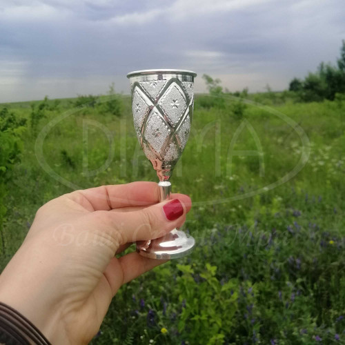 Чарка срібна на ніжці з гравіюванням у формі ромба та трикутника. Срібло 925 проби, без покриття. Об'єм чарки 50 мл. Висота 116 мм. Діаметр зверху 48 мм.