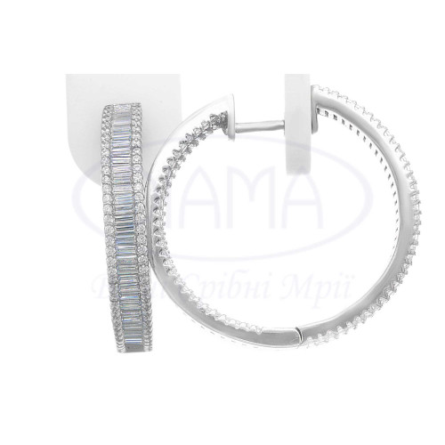 Сережки срібні з білим цирконом. Срібло 925 проби, покрите родієм. Розмір сережки 30 мм, ширина 3 мм.