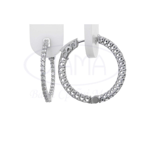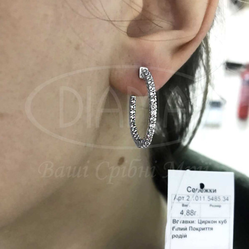 Срібні сережки з білим цирконом. Срібло 925 проби, покрите родієм. Розмір сережки 24.5 мм, ширина 1.9 мм.