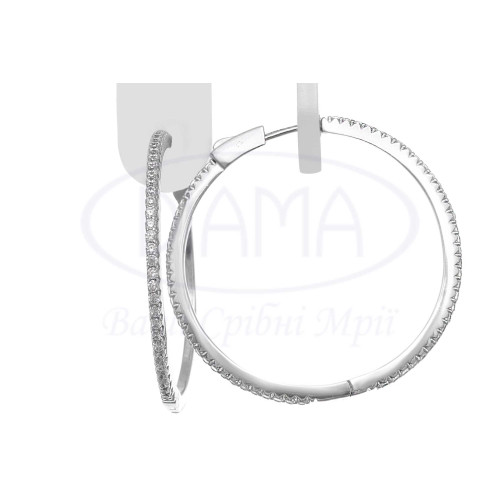 Сережки срібні з білим цирконом. Срібло 925 проби, покрите родієм. Висота сережки 40 мм, ширина 2 мм.