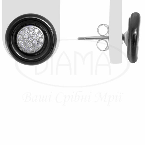 Сережки срібні з чорною керамікою у формі кругу та білим цирконом. Срібло 925 проби, покрите родієм.