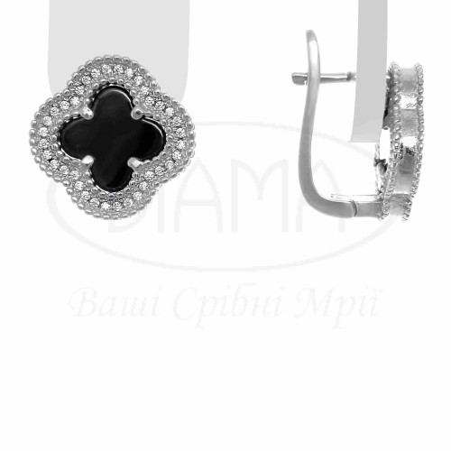 Сережки срібні з чорною керамікою та білим цирконом у формі "Клевер". Срібло 925 проби, покрите родієм. В комплекті також є каблучка та підвіска.