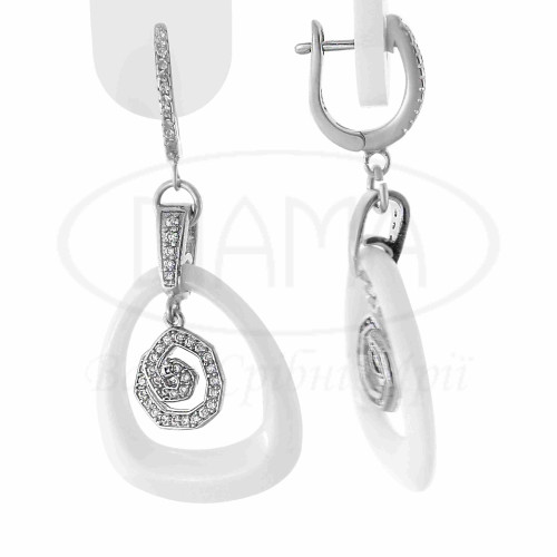 Срібні сережки 925 проби, покриті родієм. В сережках присутня ювелірна кераміка білого кольору та білий циркон.