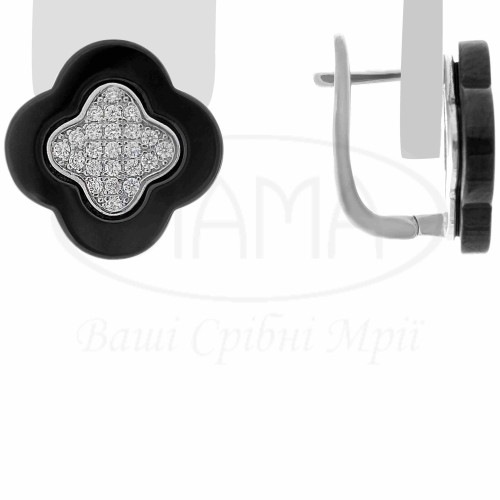 Сережки срібні з чорною керамікою та білим цирконом у формі "Клевер". Срібло 925 проби, покрите родієм. В наборі каблучка, сережки та підвіска.