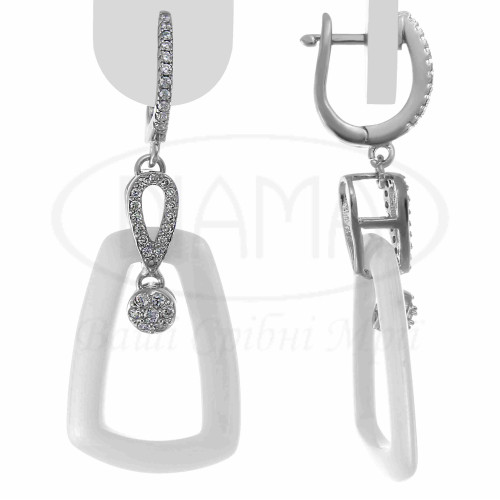 Сережки срібні з білою керамікою та білим цирконом. Срібло 925 проби, покрите родієм.