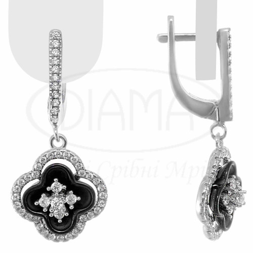 Сережки срібні з чорною керамікою та білим цирконом у формі "Клевер". Срібло 925 проби, покрите родієм. Комплект складається з каблучки, підвіски та сережок.