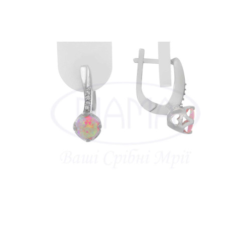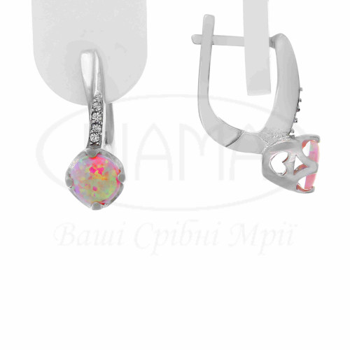 Срібні сережки з рожевим Опалом та білим цирконом. Срібло 925 проби, покрите родієм. В наборі присутні каблучка, сережки та підвіска.